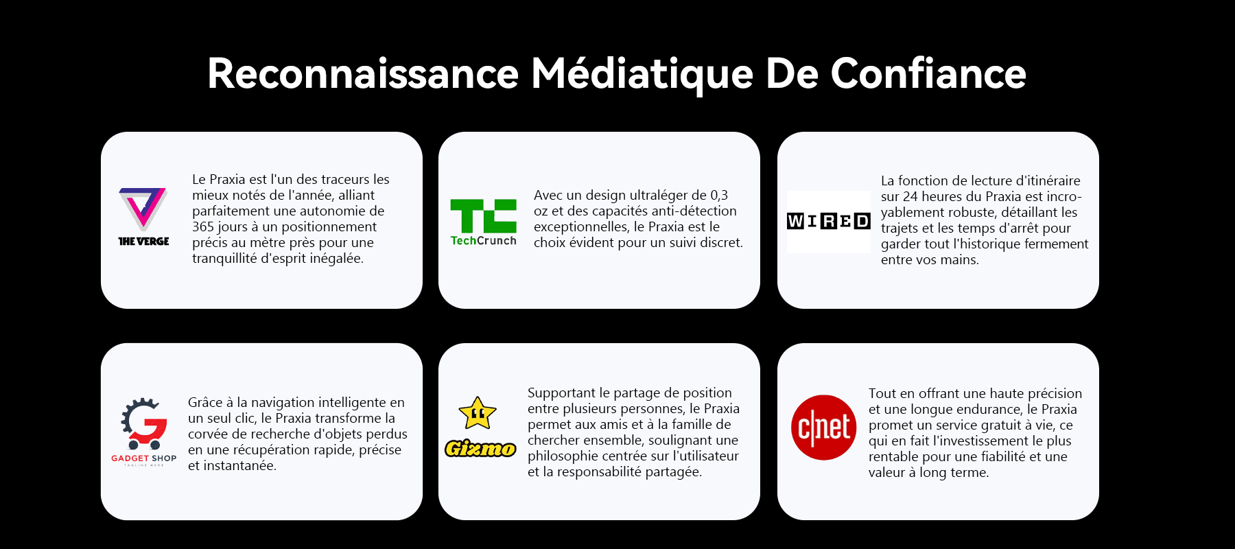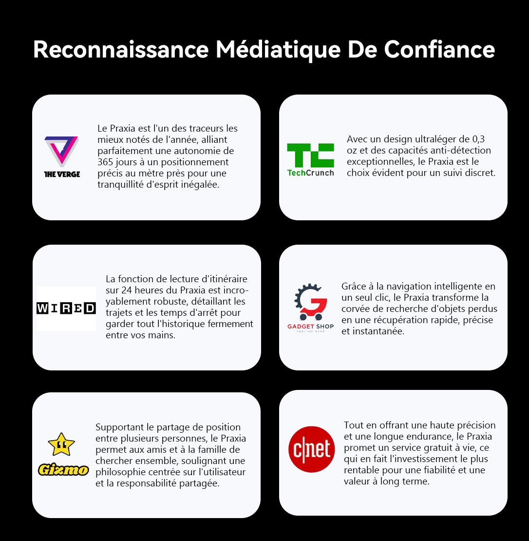 C'est ainsi que Praxia a vu le jour. Cet appareil compact et léger peut être facilement accroché à un sac à dos, glissé dans une poche ou placé dans une valise, offrant ainsi une protection sans effort. Praxia fait une promesse simple : vous permettre de rester en contact permanent avec votre famille et vos objets de valeur, vous aidant ainsi à apaiser vos inquiétudes et à avoir l'esprit tranquille.